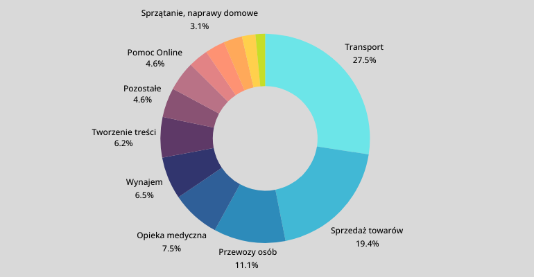 Najwięcej oczywiście w transporcie – ponad 27% wszystkich osób pracujących dla Platform. Drugie miejsce to sprzedaż towarów (19,6%), a trzecie – przewozy osób (11,2%)